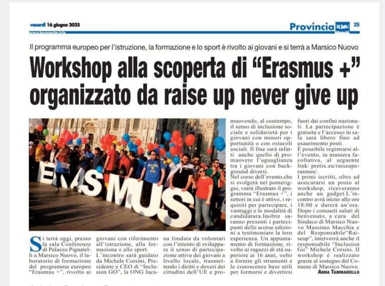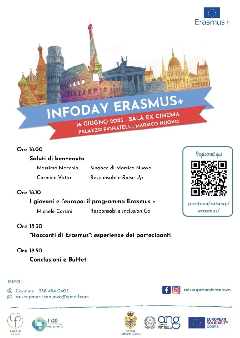 Siamo entusiasti di condividere con voi un’esperienza straordinaria che abbiamo vissuto insieme al gruppo informale “Raise Up” di Marsico Nuovo. Infatti il 16 Giugno presso il Comune di Marsico Nuovo abbiamo avuto il privilegio di collaborare con Raise Up per diffondere le nostre iniziative Erasmus per promuovere un futuro inclusivo per i giovani locali. In questo articolo, desideriamo raccontare i momenti salienti di questo evento e l’impatto che ha avuto sulla nostra missione comune.